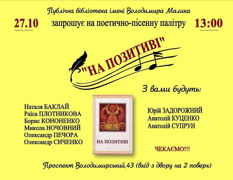Це була тепла зустріч з поетами-лубенцями Олександром Печорою, Наталею Баклай, Борисом Кононенком, які читали власні вірші. Лунали пісні у виконанні Анатолія Сопруна, Віталія Соляра, Анатолія Куценка, Юрія Задорожного на слова наших лубенців.
