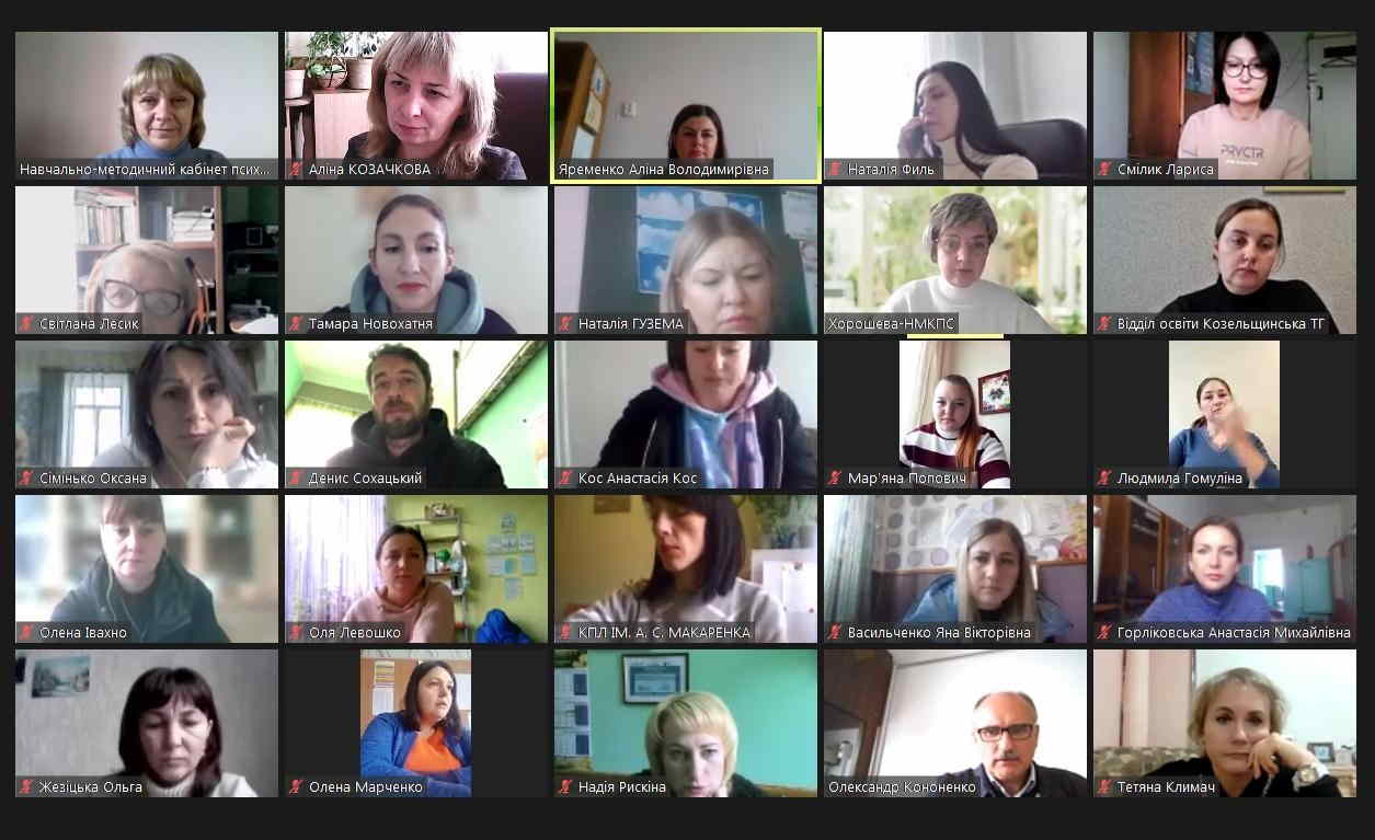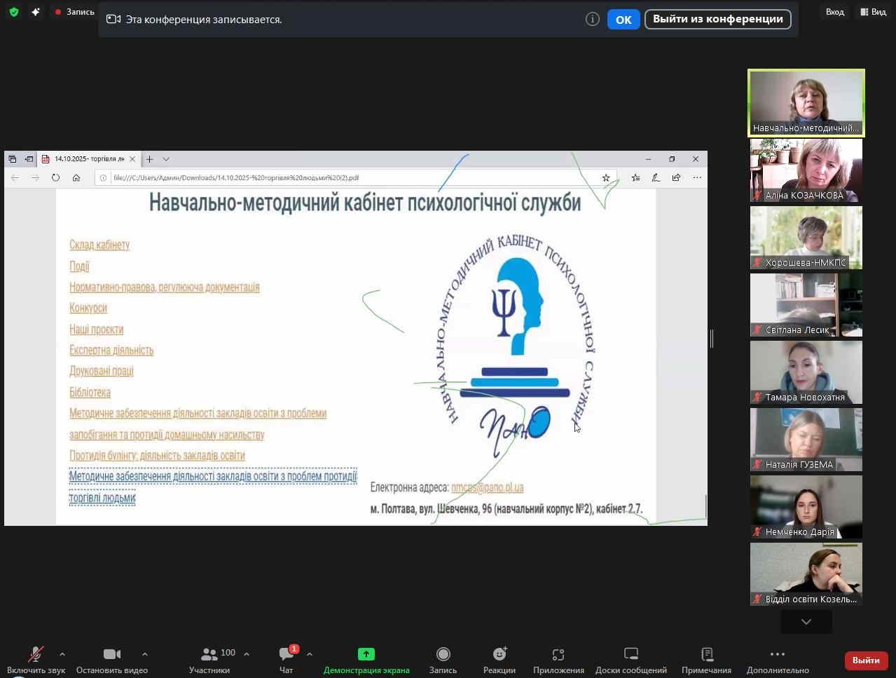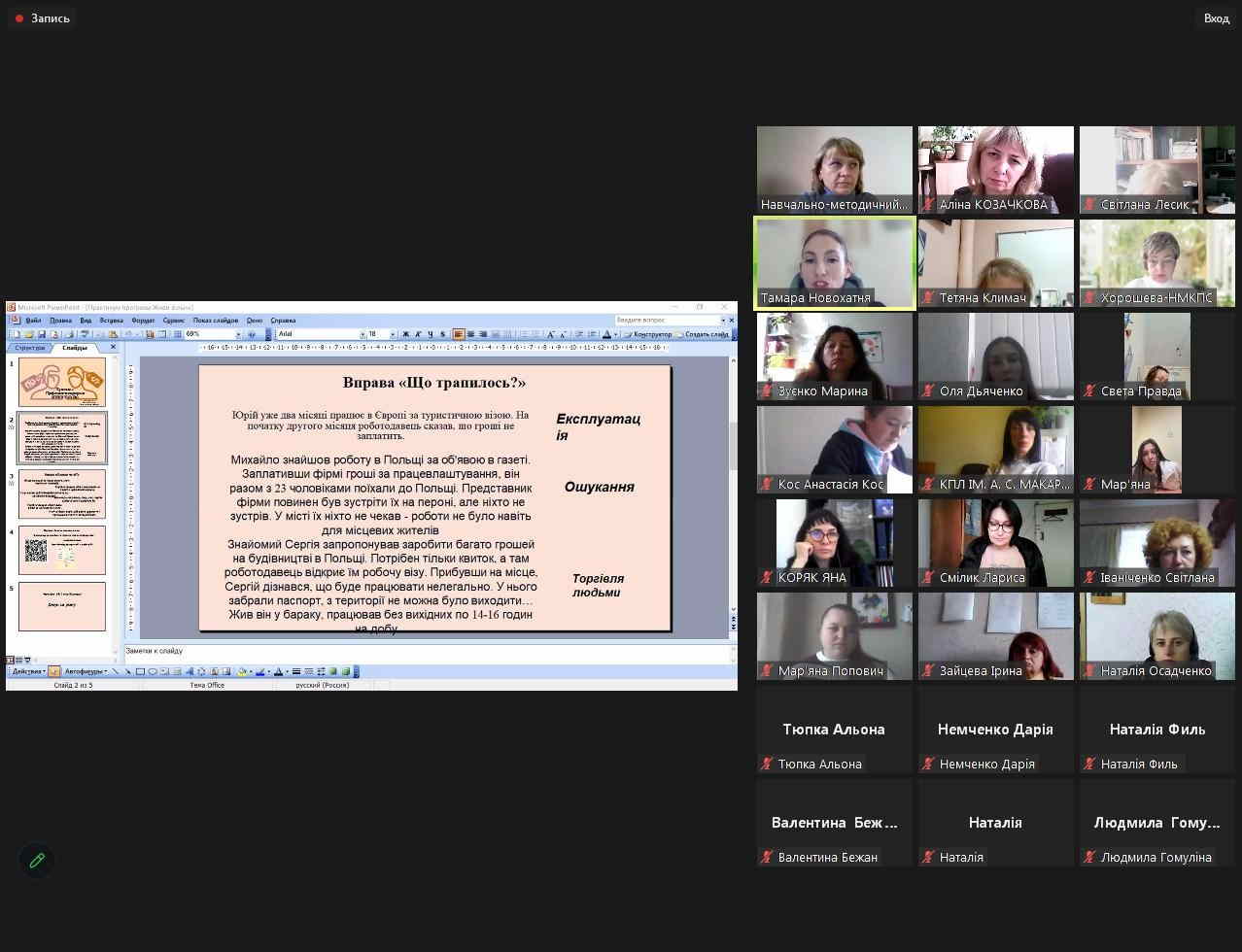 14 жовтня в режимі онлайн відбувся семінар «Протидія торгівлі людьми в закладі освіти – інструменти для роботи», у якому взяли участь практичний психолог Марина БУРДИМ та заступник директора з виховної роботи Аліна КОЗАЧКОВА.
