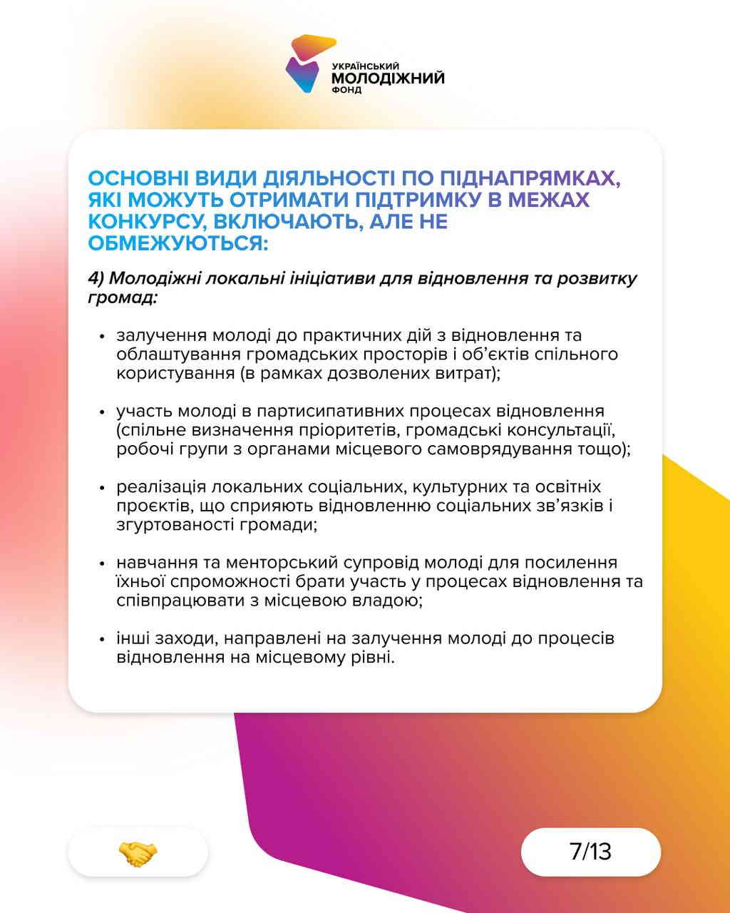 Проєкти, що посилюють участь молоді та згуртовують громади. Серед видів діяльності: