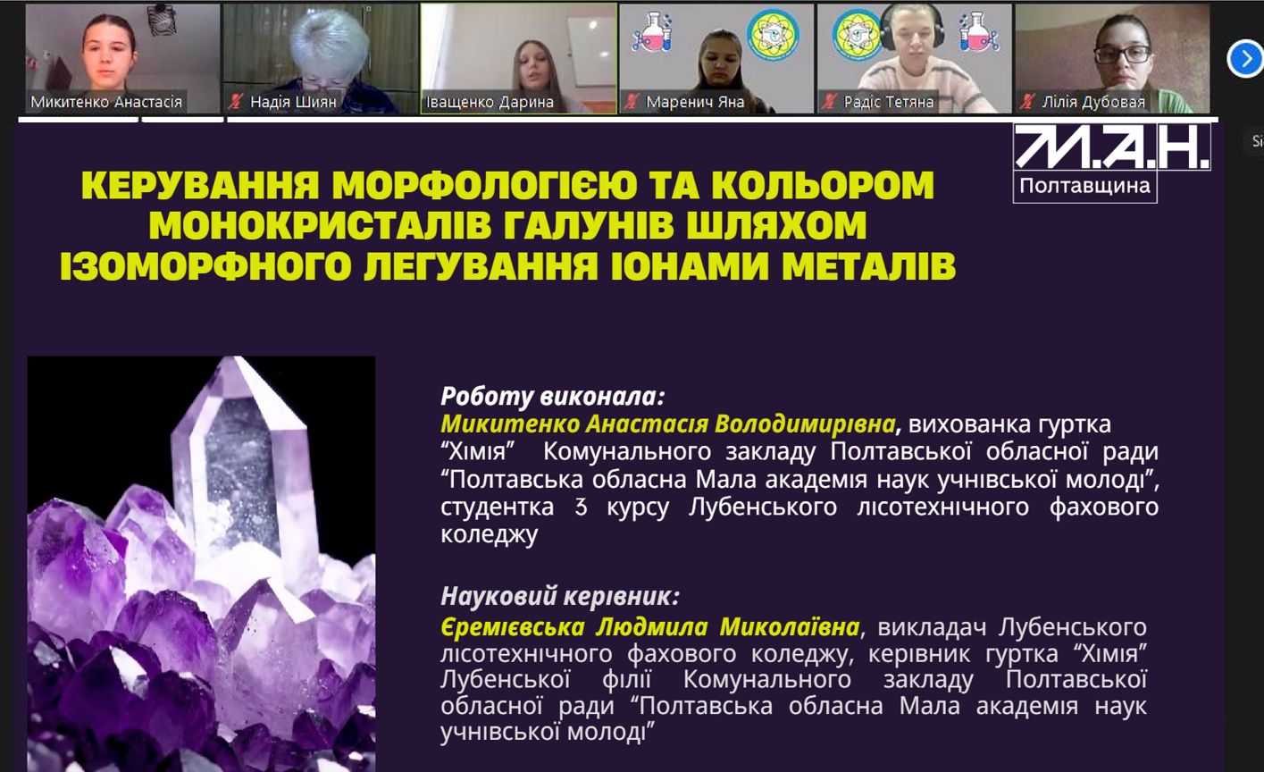 Серед сотень талановитих учасників свій науковий проєкт на тему «Керування морфологією та кольором монокристалів галунів шляхом ізоморфного легування іонами металів» гідно представила студентка групи СПГ-31 спеціальності «Садово-паркове господарство» Анастасія МИКИТЕНКО. Її робота стала результатом плідної співпраці з науковим керівником – викладачем коледжу Людмилою ЄРЕМІЄВСЬКОЮ.