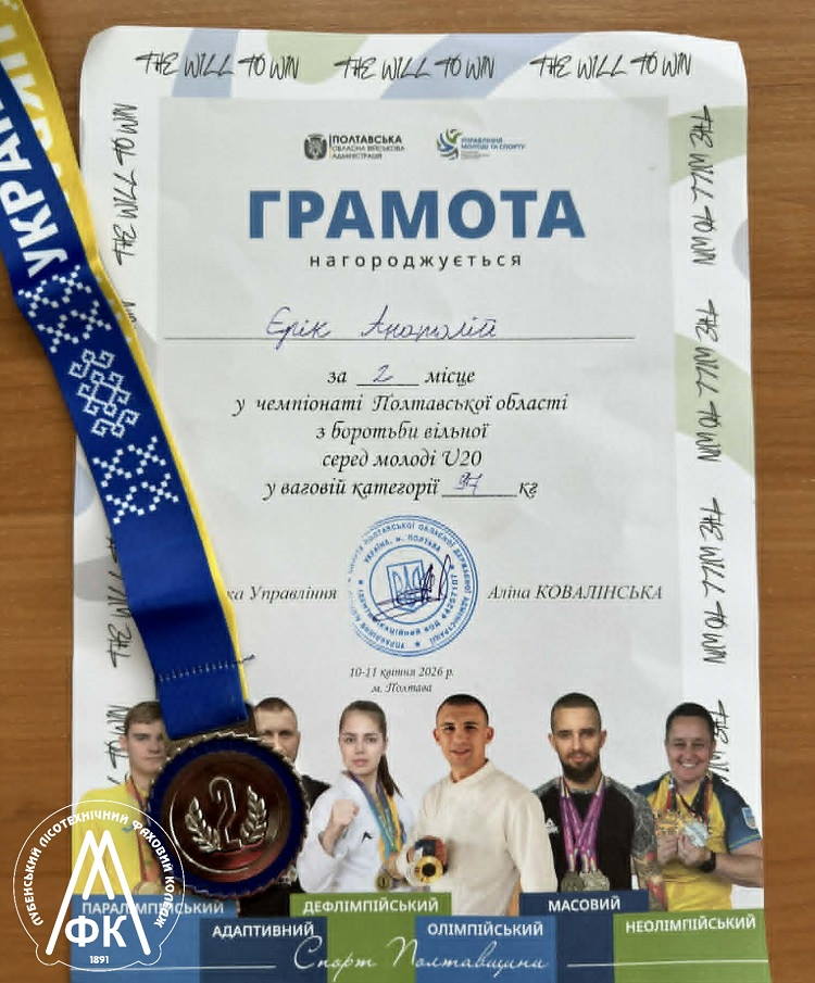 Студент групи ЛГ-31 (спеціальність «Лісове господарство») Анатолій ЄРІК посів друге почесне місце у чемпіонаті Полтавської області з вільної боротьби серед молоді U-20 (м. Полтава)
