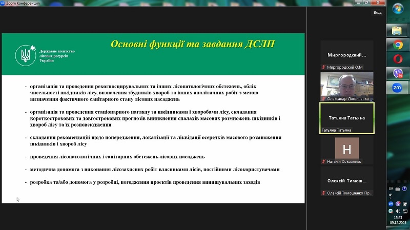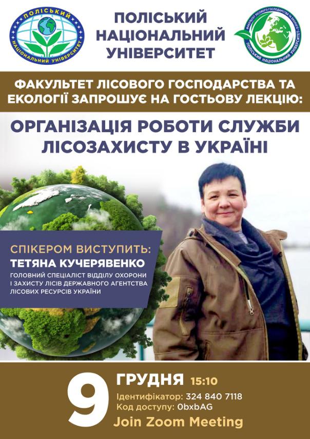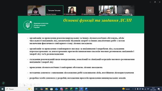 9 грудня викладачі Ангеліна ЧИЧУЛ та Олександр ЛИТВИНЕНКО та студенти ІІІ курсу коледжу в онлайн режимі долучилися до гостьової лекції «Організація роботи служби лісозахисту в Україні», яку провела Тетяна Кучерявенко – головний спеціаліст відділу охорони і захисту лісів Державного агентства лісових ресурсів України.